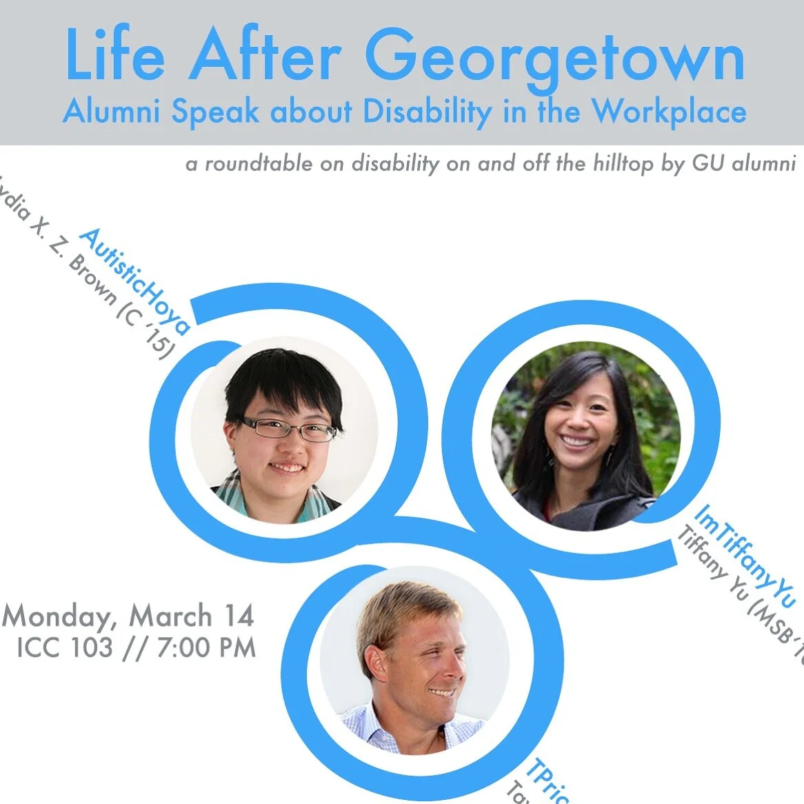 It was great to participate in a panel discussion at Georgetown University about “Disability in the Workplace and Life after Georgetown” with two fellow alumni, Tiffany Yu and Lydia Brown. The event was hosted by the professors of the newly established Georgetown Disability Studies cluster and was attended by approximately 75 undergraduate students. It was nice to see how the Disability Studies initiative is growing and I predict that this is a focus area that will continue to expand on campus given the many different aspects of “disability” that can be studied. A special thank you to Bill Reynolds, Associate Vice President of Alumni Relations and the Annual Fund, for providing opening remarks and helping to underwrite the cost of the event.